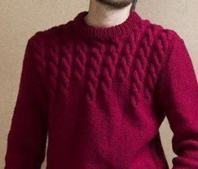 Свитер для сильной половины человечества связан спицами. Основной узор свитера — лицевая гладь. Верх свитера украшен дорожками «кос» разными по размеру. Свитер связан спицами №6 из пряжи следующего состава — 75% шерсть и 25% полиамид.