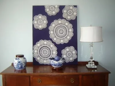 Если вы любите вязать салфетки и у вас скопилось их большое количество, то Нэнси предлагает использовать их в декоре интерьера таким интересным способом. Она сделала настенное декоративное панно с помощью деревянного подрамника, синей ткани и нескольких кружевных салфеток.