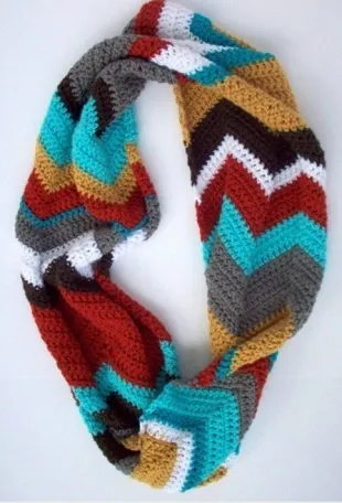 Снуд вяжется узором зигзаг разными оттенками пряжи.
