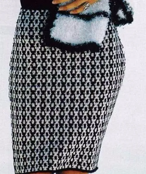 Юбка связана двухцветным узором в жаккардовой технике спицами № 3,5.