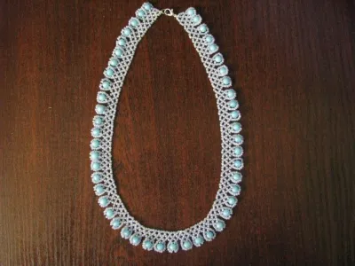 Залежались у меня бусы перламутровые голубые. Красивые, но я не ношу бусы. Купила обычный бисер в киоске, тоже голубой. Купила шелковые нитки для бисера и тонюсенькие иголочки. Попалась в интернете схема ожерелья. Результат показываю.Схему прилагаю.