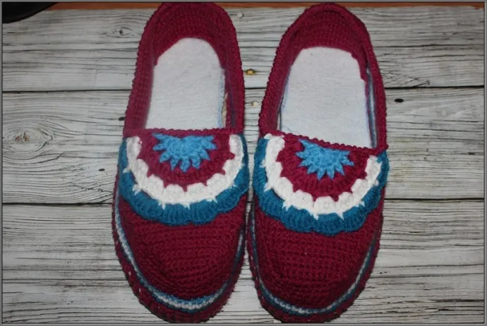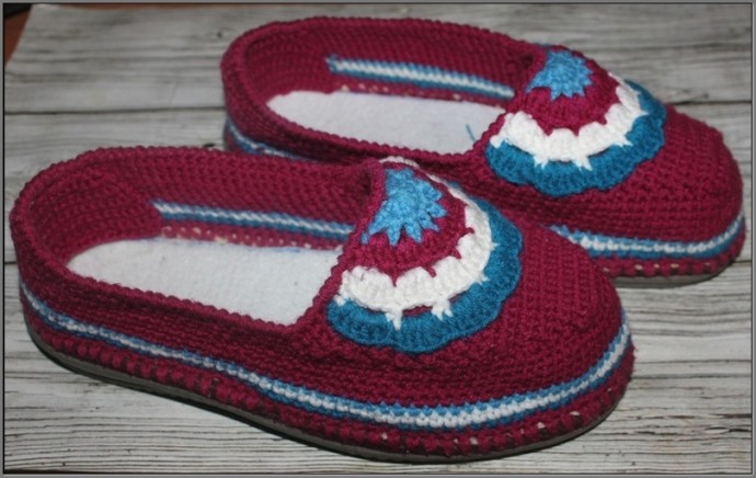 Давно хотела попробовать связать себе тапочки на готовой подошве...Ниточки Ланаголд от Ализе - полушерсть 240 м в 100 г (остатки ).Крючок 2 мм.Взяла старые тапочки,отрезала от них ткань,оставив по всему периметру полоску высотой примерно 1 см .Затем обвязала по кругу ,делая дырочки шилом.Боялась ,что основного цвета не хватит,поэтому пустила цветные полоски(был неполный моток бордового цвета),но оказалось,что ниточек хватило бы и без полосок,т.к. даже немного осталось. Для укрепления пятки связала подпятник и пришила с внутренней стороны.Для того,чтобы при одевании тапочка край верхней части не заворачивался внутрь,связала декоротивный элемент и тоже пришила для укрепления..В тапочки вложила стельки.Получились вполне комфортные домашние тапочки.Вязала без описания,поэтому ляпы конечно есть,но меня вполне устраивает.Надеюсь,что следующие тапочки получатся лучше.