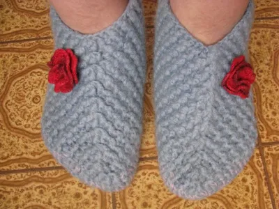Так как ниточки с шерстью, тапочки получились очень теплые, мой ревматизм в них утихает! Украсила тапочки розочками.