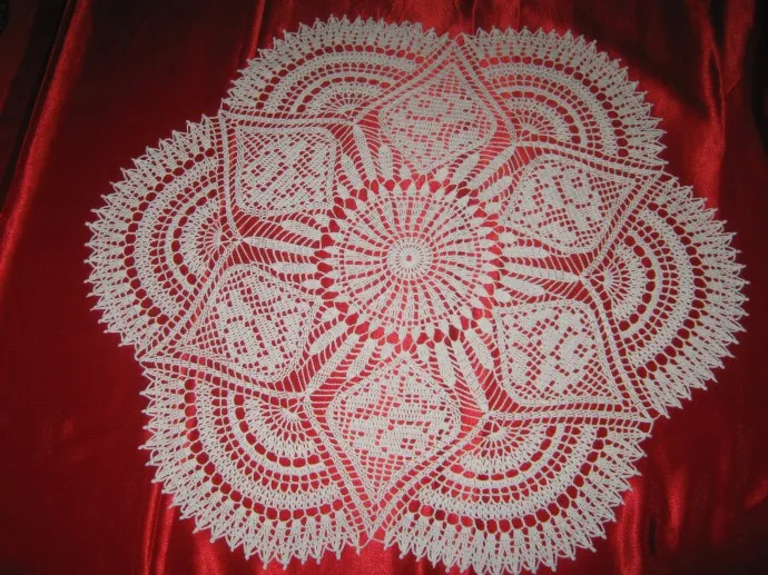 салфетка получилась в диаметре 62 см , вязала из ниток купленных еще в СССР под названием лилия, и крючок 1,25