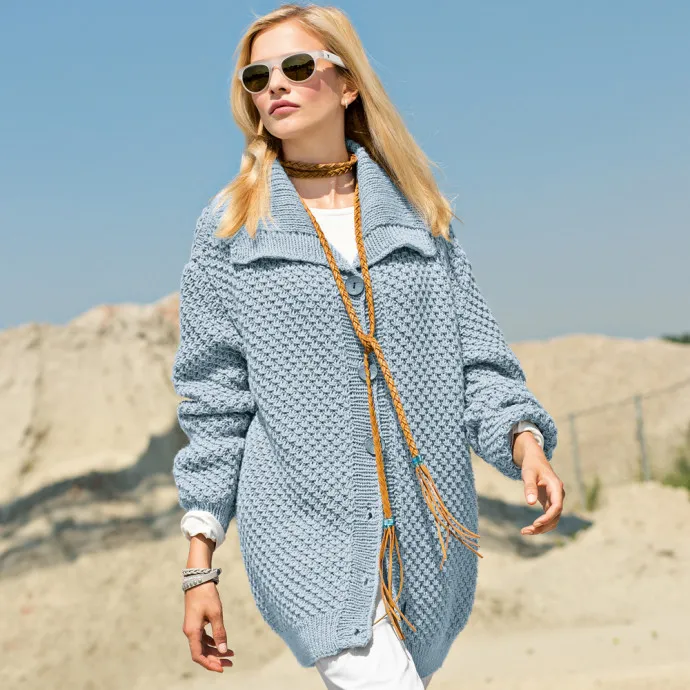 ВАМ ПОТРЕБУЕТСЯ: Пряжа (100% шерсти; 180 м/100 г) — 900 (1000) 1100 г голубой; спицы №5 и 5,5; круговые спицы №5 и 5,5; 6 пуговиц.