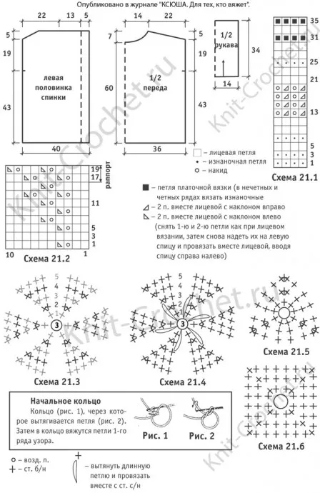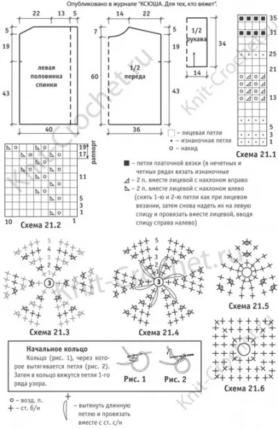 Рукав: на спицы набрать 66 п. и связать 36 рядов каймы узором по схеме 21.1, далее лицевой гладью. При этом в центре через каждые 8 рядов лицевой глади выполнить 4 полосы «защипа» в следующем порядке: 1-й на средних 30 п.; 2-й – на 24 п., 3-й – на 20 п. и 4-й на всех петлях ряда. Далее до конца на всех петлях вязать лицевой гладью. На высоте 34 см от начала закрыть все петли. Второй рукав вязать аналогично.