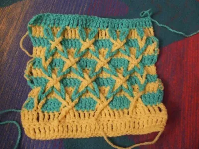 Провяжите необходимое число рядов узора в высоту, но не выполняйте два заключительных ряда. Обратите внимание, что, если вы вяжете из пряжи двух цветов, то цепочка из в.п. и первые два ряда вяжутся одним цветом (в нашем случае — желтым), а, начиная с 3-го ряда, нужно вязать поочередно ряд пряжей одного цвета, ряд пряжей другого цвета.Закончить узор нужно нечетным рядом (в нашем случае это ряд зеленого цвета)!
