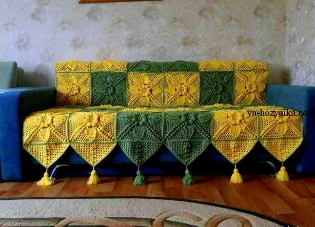 Этот роскошный плед крючком выполнен из больших красивых мотивов. Для вязания этого шикарного пледа используются квадратные цветочные мотивы, на плед их нужно вывязать 30 шт., из них желтого цвета 18шт и зеленого 12 шт. после того как все мотивы будут готовы их соединяем столбиками без накида зеленой пряжей. Также используя только 1 мотив можно связать интересные сидушки, см. фото ниже.
