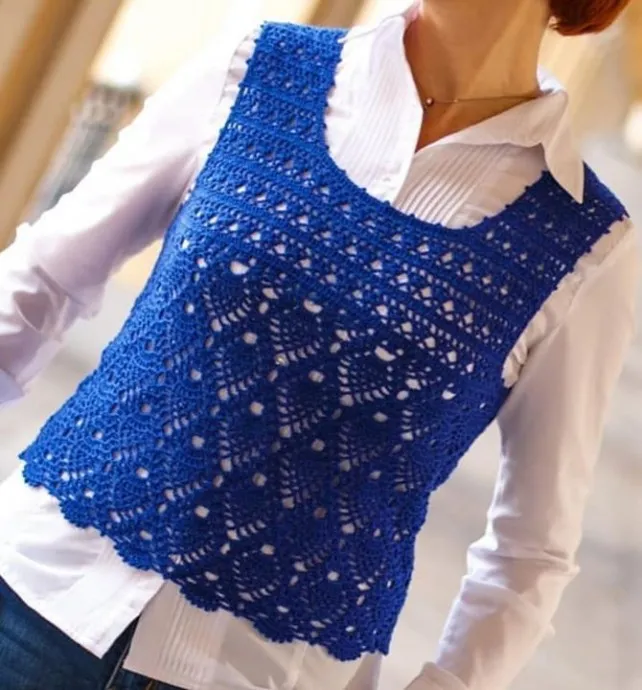 Кусочек узора похож на верх этой безрукавки. Здесь только вместо пустых клеточек — ряд из столбиков с накидом. Смотрится лучше! Жаль, что у меня уже связано 3/4 работы…