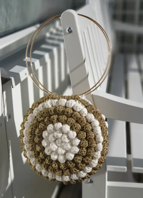 Пряжа макароная белая хлопок и золотая синтетика. Металлические кольца-ручки 20см. диаметр.крючок#8.