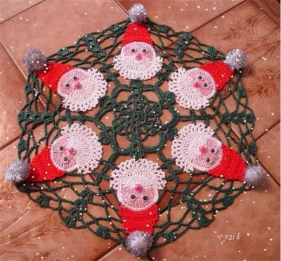 В одном из вязяльных сообществ увидела такую компактную и простую (вроде бы) салфеточку с Дедами Морозами. Подумала, что схема этой работы пригодится коллегам-вязальщицам.