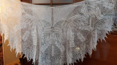 "Ландыши серебристые", светло-голубого цвета, из кид-мохера в одну нить. Вес 105 г. Длина по ленточке 195 см, высота по центру - 90 см.