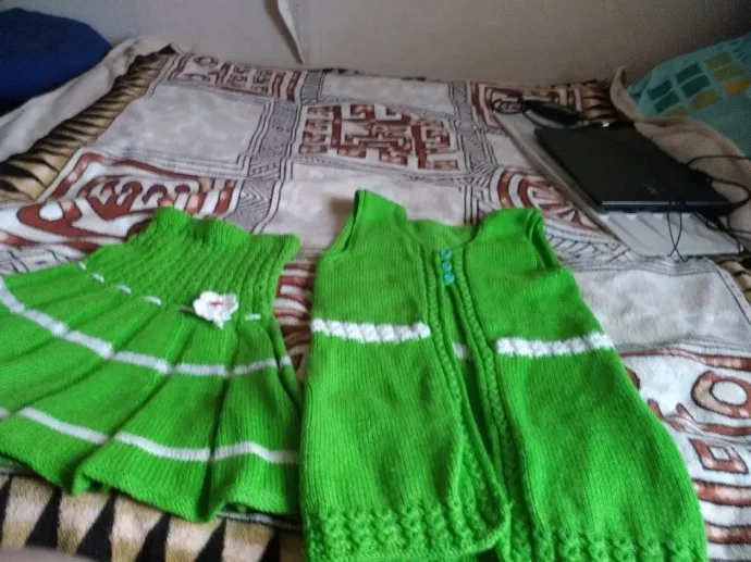Немного, технических данных: blush: пряжа называется "Пехорка, детский каприз" моточки небольшие круглые такие по 50 гр. 225 метров в мотке, вязала в две нитки от 2-х клубков, спицами № 3,5 (пробовала более тонкими пока ещё толку не хватает: pardon:). На юбку ушло, 4 полных мотка и ещё немного от новых моточков зелёного цвета, (из имеющихся тогда 6-ти), да небольшой клубок, неизвестной белой синтетики, нашла в запасах. Для жилетки использовала все зелёные остатки и докупила, ещё 5 мотков основного цвета. ВСЕГО 11 МОТКОВ остался лишь 1.