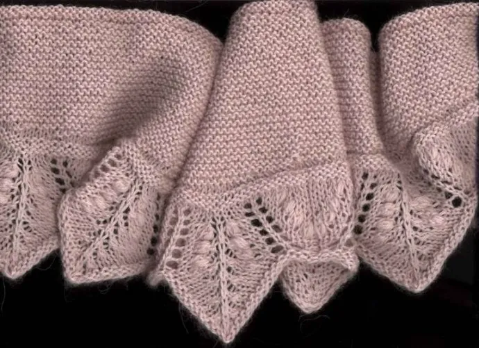 Ряд 12: 2 изн, *(1 лиц, шишечка, 2 лиц, накид, 1 лиц, накид, 2 лиц, шишечка, 1 лиц, провязать 2 вместе лицевой с протяжкой, с2лпр, провязать 2 вместе лицевой, 1 лиц, шишечка, 2 лиц, накид, 1 лиц, накид, 2 лиц, шишечка, 1 лиц, 1 изн)*, 1 изн.