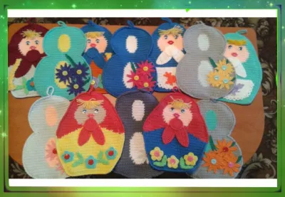 Такие прихватки будет жалко использовать на кухне! Собачки чудесные, хомячу себе. И 8-ки и матрешки — опять хомячу! Спасибо!