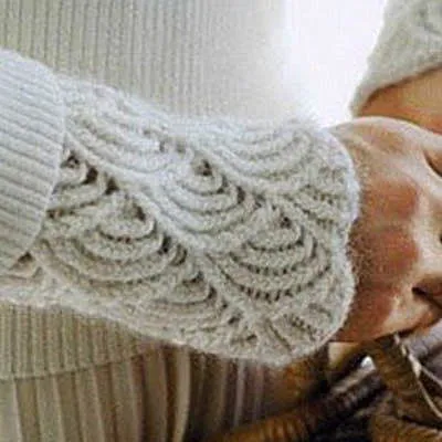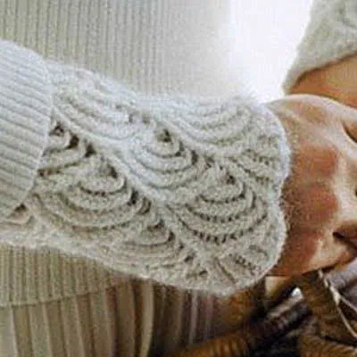 Очень красивый узор спицами в виде чешуек. Так можно сделать отделку вязаному изделию.