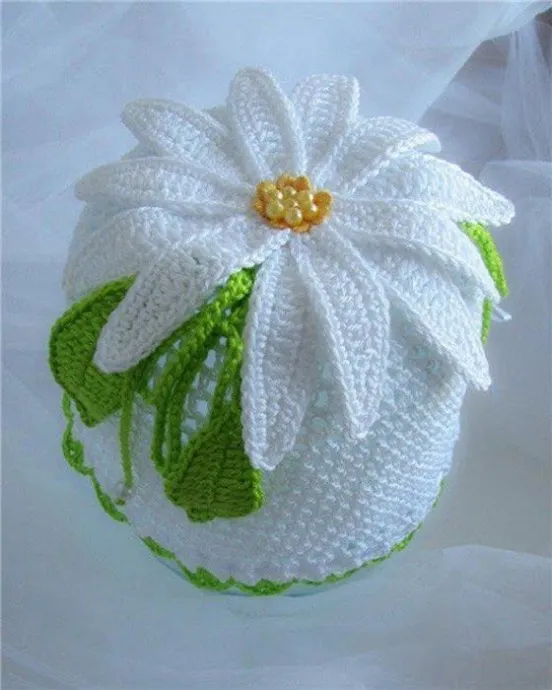 Листики вяжем по схеме 4, регулируя размер дополнительными столбиками. Пришиваем цветок и листочки к донышку шапочки как показано на картинке. Шапочка готова!