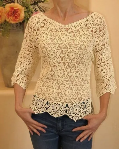 Вот навязала я мотивов.соединила их в ходе работы.а дошла до пройм и до горловины и остановилась.А чего остановилась-не знаю
