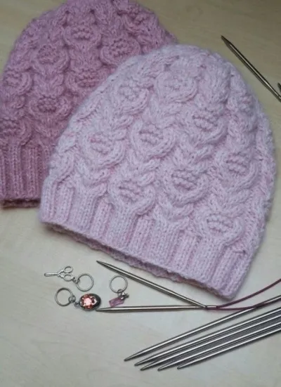 Светлая шапочка связана в 4 нити — 3 нити бледно-розового и 1 нить розового цветов. Вы можете вязать шапочку различными цветами, выполнять красивые цветовые переходы, все зависит от Вашей фантазии.