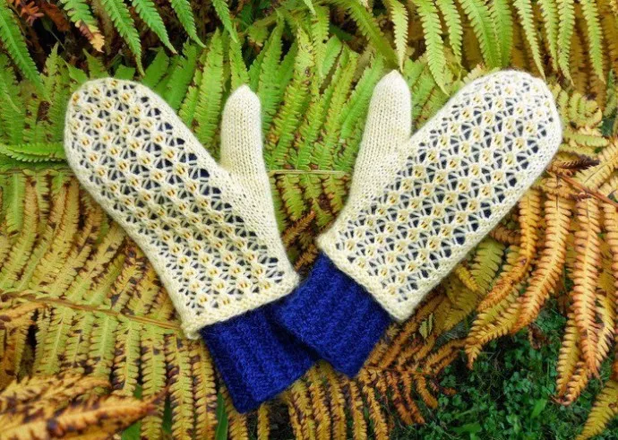 на спицы №3 желтой нитью наберите 40 п., распределите петли на 4 спицы следующим образом: 11-11-9-9 п. Смена ряда -между 4-й и 1-й спицами. Вяжите 1 ряд лиц. петлями, 1 ряд изн. петлями, 1 ряд лиц. петлями, 1 ряд изн. петлями и еще 1 ряд лиц. петлями. Далее петли 1-й и 2-й спиц вяжите лиц. гладью, а петли 3-й и 4-й спиц вяжите ажурным узором, начиная с 1-го ряда схемы, следующим образом: вяжите петли 1-й и 2-й спиц лицевыми, в начале 3-й спицы вяжите 1 лиц. п., затем провяжите 16 п. ажурного узора и в конце 4-й спицы вяжите 1 лиц. п. Повторяйте 1-4-й ряды схемы 2. Одновременно с этим через 8 рядов от начала лиц. глади на 2-й спице начинайте выполнять прибавления для формирования клина большого пальца. Для этого вяжите петли 1-й и 2-й спиц лиц., пока до конца 2-й спицы не останется 3 п., прибавьте 1 лиц. п. (= поднимите поперечную нить между петлями и провяжите ее лиц. скрещ. п.), затем провяжите 2 лиц. п., снова прибавьте 1 лиц. п. и провяжите еще 1 лиц. п., довяжите ряд до конца. Выполняйте такие прибавления (в тех же местах) в каждом 3-м ряду еще 5 раз. В каждом ряду с прибавлениями количество петель клина увеличивается на 2 п.