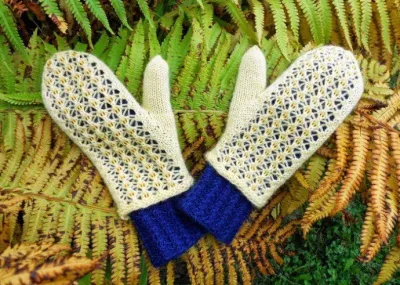 на спицы №2.5 синей нитью наберите 44 п.. равномерно распределите петли на 4 спицы. Смена ряда - между 4-й и 1-й спицами. Вяжите вкруговую рельефным узором, начиная с 1-го ряда и повторяя 4 п. раппорта 11 раз. Повторяйте 1-3-й ряды. На высоте манжеты 8 см продолжайте вязать лиц. гладью и через 2 ряда начинайте выполнять прибавления для формирования клина большого пальца. Для этого вяжите петли 1-й и 2-й спиц лиц., пока до конца 2-й спицы не останется 4 п., прибавьте 1 лиц. п. (= поднимите поперечную нить между петлями и провяжите ее лиц. скрещ. п.), затем провяжите 2 лиц. п., снова прибавьте 1 лиц. п. и провяжите еще 2 лиц. п., довяжите ряд до конца. Выполняйте такие прибавления (в тех же местах) в каждом 3-м ряду еще 5 раз. В каждом ряду с прибавлениями количество петель клина увеличивается на 2 п. После выполнения всех прибавлений провяжите 1 ряд без прибавлений. В следующем ряду перенесите 14 п. клина на булавку, на этом месте наберите новые 2 п. и продолжайте вязать вкруговую лиц. гладью.