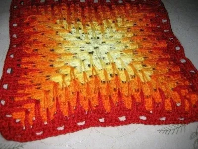 На фотографии "бабушкин квадрат" выполняется от светло-желтого к терракотовому и рисунок начинает смотреться уже после вывязывании 8-10 рядов, что надо учитывать .