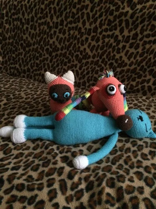 У подруги в этом году внуку исполнилось 2 года. В подарок связались такие игрушки. Кот-сплюшка и котопес. Котопес связан из Ян арт джинс, а сплюшка Ализе беби. Сначала я связала таксу-радугу своему внуку, а Артёмке захотелось связать именно Котопса. Вот такие игрушки и получились. Темка доволен, с котом вместе спит.