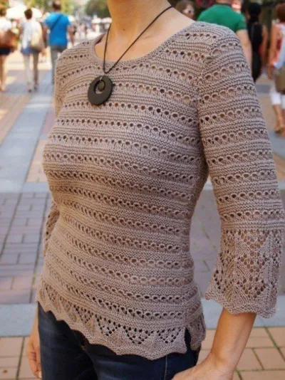 Ажурные пуловеры спицами это всегда красиво, легко и очень нарядно. Этот пуловер будет выглядеть уместно в любом гардеробе. Красивый несложный узор подчеркнёт силуэт, цвет придаст изысканность, ажур - озорства модели.