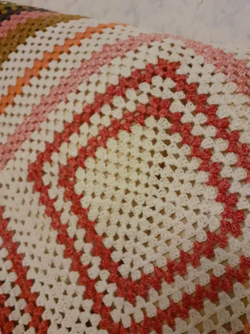 плед связан на основе Бабушкиного квадрата из самых разных ,фактически бросовых ниток. Нитки разной толщины, поэтому чтобы привести к одному знаменателю добавляла и смешивала разную пряжу. Белые и коричневые нитки- распущенные свитера, оранжевые- шапка. Пледу около 10 лет, конечно поизносился. Но верой и правдой служит до сих пор.