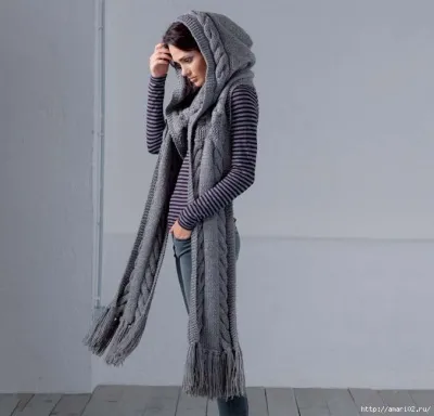 По-моему вещичка нужная в гардеробе. Уделите несколько вечеров и она будет превосходно смотреться на Вас. Скоро зима, так что такой шарф-капюшон сможет защитить Вашу голову и шею от холода.