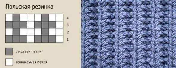 Польская резинка считается одним из универсальных узоров из-за того, что рукодельницы используют его для вязания многих изделий. Только опытные мастерицы легко могут отличить польскую резинку от французской и рижской, с которыми часто путают. Хотя отличия совсем не большие, но все же они есть. Польская резинка состоит из крупных борозд, которые разделяются равносторонними гранями и имеет плотную структуру.