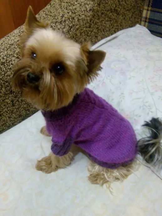 Мне тоже заказали свитерок для Йорка, но первая попытка у меня не получилась — или слишком по размеру (туго ему) или сам Йорк не хочет носить…