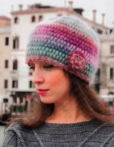 Цепочку из 6 возд.п. замыкаем в кольцо. Затем продолжаем по схеме 1 до нужного диаметра шапки, далее вяжем прямо. По нижнему краю шапки свяжите узор по схеме 2. На схемах 3, 4 и 5 изображено, как изготовить 3 цветка. Соедините их между собой. С помощью булавки приколите на шапочку.