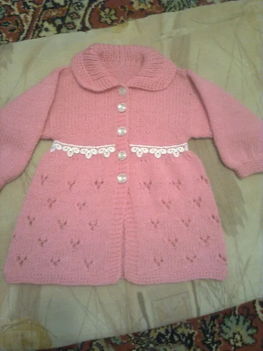 эта кофточка была связана по мотивам комплекта из журнала (фото прилагается) . В оригинале это на ребёнка до 3 мес, я вязала на 9-12 мес. Пряжа Кроха. Цвет на фото получился блеклый. На самом деле нежно- розовый. Капюшон заменила воротничком, мне показалось что так удобнее. К сожалению, нет фото ребенка в одежке. Смотрелось хорошо .