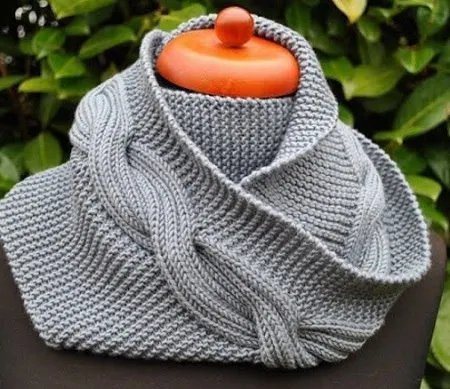 Необыкновенно женственный снуд, который можно за короткое время связать спицами. Снуд связан платочным узором. В верхней части снуда проходит широкая коса. Снуд связан из пряжи «стального» цвета, который замечательно сочетается со всеми цветами. Для вязания снуда желательно выбрать спицы №5. Коса же связана достаточно не обычно, её полотно представляет собой не традиционную лицевую гладь, а резинку два на два.