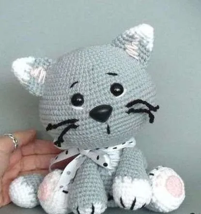 Следующий этап: сшить все части, пришить бусинки-глазки, вышить бровки, усы, когти черными нитками.