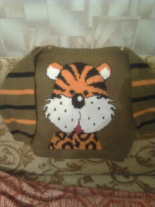 вязала их очень давно. С тигром ,по-моему, и Сандры . Вязала ещё с лошадкой ,увы,фото не сохранилось . А жаккардовый был любимый у сына. Фото сделано когда уже джемпера носились не один год ( передавались от одного ребенка к другому ) поэтому немного растянулись.