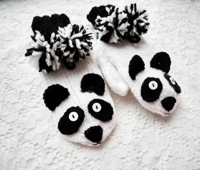 Вторая пара зверо-варежек из одного заказа,на этот раз - панды. В прошлом году я вязала такие же, только на взрослую руку). В этом году - детские. Варежки связаны из Ализе ланаголд,спицы 3,5 . Ушки,носики,пятнышки под глазки связаны крючком и пришиты. Также варежки украшены чёрно-белыми помпонами. В галерее с фото также выкладываю фотографии варежек-зверят вместе - львят(из прошлого поста) и панд.