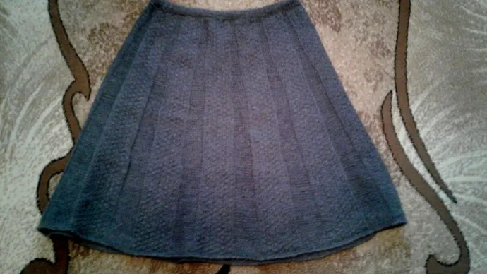 Юбка связана из полушерсти в 4 сложения, спицами №3. Вяжется сверху на 4 спицах 6 см. лицевой вязкой. Через 3 см. связать 1 ряд:2 вместе,накид и т.д. это нужно для перегиба. пояса. Далее вяжутся клинья (рисунок чередуется с изнаночной вязкой.)Чтобы юбка стала расклешенной к низу,через каждые 10 см. делаются прибавления в лицевом ряду. с двух сторон клина. Низ юбки оформляется рачьим шагом крючком №3.Верх кетлюется и вставляется резинка соответствующей ширины.