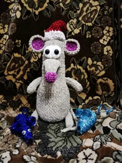 Вот такой символ года получился, который сегодня ушел в школу на выставку. Большой крыс связан из плюшевой пряжи в две нити крючком 2,5см. Рост без шапочки 20см, пряжи ушло около 70г., маленькие мышки сделаны из синельной проволоки.