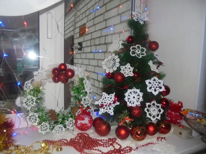 Снежинки замечательные! Но если их у вас много вяжите что то другое. В прошлом году у меня были шары штук 20. На вайнахты приезжали дети после их отъезда осталось 5шт. В этом 3 снеговика, 2 мышки, а на следующий буду снежинки вязать, пока схемки собираю.