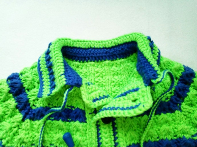 Все петли горловины обвязаны крючком рядом ст.б/н. Кулиска связана «карманом», между серединами обеих планок, по 2 ряда ст. с н. за переднюю и заднюю стенку петли нижнего ряда столбиков. Дальше закрываем «карман» одним рядом ст.с н.- это первый ряд воротника, потом провязать несколько рядов (по желанию) ст. с н. основного цвета, далее ряд (другого цвета) по лицевой стороне: * ст.с н., рельефный выпуклый (лиц.)* ст. с н., воз.петли подъема. Далее желаемое кол-во рядов ст.с н. основного цвета и я закончила рядом с.б/н.(другого цвета).