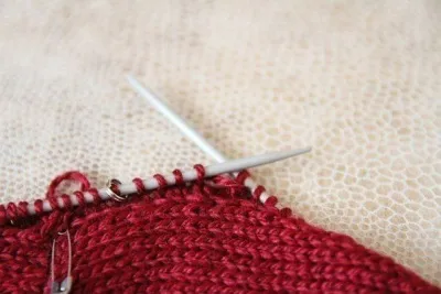 Начинаем наш ряд, вяжем от «бокового шва» до отмеченной петли и за нее, в описаниях как правило указано на сколько, в моей модели это было еще 8 петель, или 2,5 см, за центральную. Стоп. Теперь начинаем работу укороченными рядами, способ «обернуть-повернуть». Люблю его, просто и потом нет дырок. Оборачиваем следующую, у меня 9ю петлю от центра. Делаем это так: выводим нить вперед, на лицо работы.