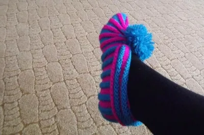 Повторить с 1-го ряда. Связать 24 малиновых полос и 24 бирюзовых полос. Складываем пополам, сравнивая углы Сшиваем. Затем сшиваем подошву. а в верхнюю часть(12 полосок малиновых и 11 бирюзовых) продеваем нитку в петли вязки и стягиваем. Тут еще я приделаю помпон сверху. Затем оставшиеся полоски (верх)- набираем на спицы 50петель и вяжем так же по рисунку полосками. А можно еще загиб вязать вязкой Кукурузка.....