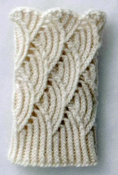 Набрать 52 п (= 5 х 10 + 2 кромочные). Вязать прямыми и обратными рядами по схеме.