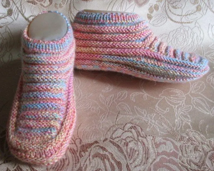 Тапочки спицами НАДЕЖДА ТОКАРЕНКО На спицы №3 набираю 59 петель.Вяжу полой резинкой 1на1. Далее вяжу рисунком. беру нить другого цвета. 1ряд-3лиц,1п снять нить за работой. 2ряд-1п снять нить перед работой. 3лиц. 3ряд- нить основного цвета-1лиц. 1снять нить за работой, 3лиц и т д. 4ряд-3лиц, 1снять нить перед работой. Вяжем так на желаемую высоту и делим вязание на 3 части ( 23-13-23) и дальше вяжем только средние 13 петель платочной вязкой на нужную вам длину.(до мизинца) Это мысик. Затем набираем по краю мысика петли ( 17 или 18 ) с обеих сторон+ те, которые остались на боковых спицах. Теперь снова вяжем рисунком на нужную высоту(где-то 4-5см) Далее берём средние 14петель и вяжем как пятку у носка,убавляя пока не уйдут все боковые петли. Затем сшить и всё!!! УДАЧИ!!! Рисунок к этим тапочкам. 1ряд-все лиц. 2ряд- все изн. 3ряд-все лиц. 4ряд-все лиц. 5ряд-все изн. 6ряд-все лиц 8ряд- повторяем с 1ого ряда