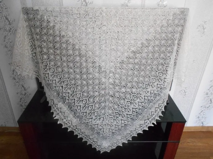 Ажурная паутинка "Северная жемчужина",(автор дизайна nagetim СМ), из козьего пуха с добавлением шелка, полностью ручная работа, связана от центра, вес 150 гр.размер 140 х 140 см., 5000 руб. + почтовые расходы.