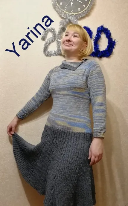 Ура! Я закончила наконец второе платье! Верх связан из пряжи "Тепло и уютно" (100% шерсть) 100гр - 400 м. Юбка связана из пряжи "Elegant" от Вита 100 гр - 400 м Первый ниточки лежали несколько лет. Их было всего 4 моточка и боялась что на полноценную вещь не хватит. Потом под конкретный проект взялись серые ниточки и тоже звезды не сложилось. А наводила порядки в своих "закормах" и вдруг стукнуло))) Смотрите что у меня получилось... Название выдала невестка как только надела его))