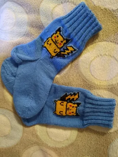 Носки, связанные на спицах цветным узором в жаккардовой технике.