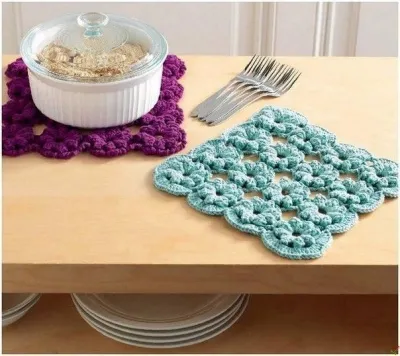 Отличный и супер красивый вариант подставочки под горячие. На самом деле такую вещичку под горячий чайник или кружку жалко подкладывать. Такие цветочки можно использовать, по другому назначению. Но это уже ваша фантазия.